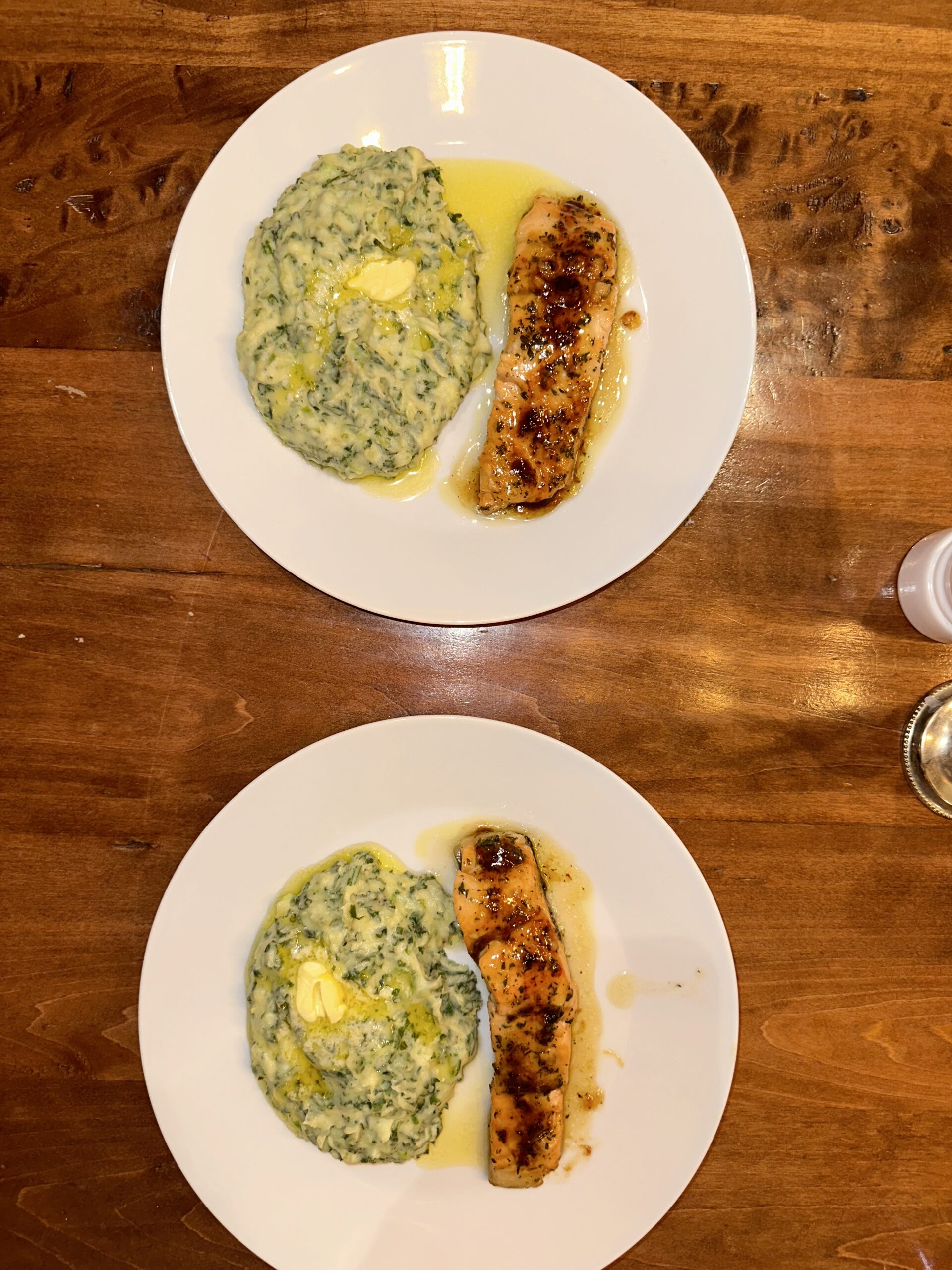 For dinner, we experimented with an Irish roasted salmon, accompanied by colcannon. The salmon recipe called for a honey whiskey marinade that didn’t turn out as I hoped. First of all, I didn’t use whiskey. The thought of whiskey makes me want to vomit. But, likely due to the absence of whiskey, the marinade which consisted of honey, lemon, olive oil, apple cider vinegar, and thyme, tasted rather vinegary. Despite the recipe suggesting oven baking, I chose to cook the salmon stovetop to caramelize the honey marinade, and this decision turned out wonderfully.