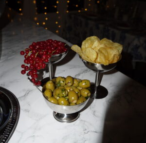 I put out some very simply snacks—truffle potato chips, garlic and parsley olives, and sweet berries—for my guests to pick at during cocktail hour when they first arrived.