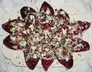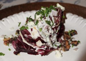 To start, I served a festive take on my wedge salad. By “festive,” I mean substituting radicchio for iceberg lettuce and leaving it in wedges rather than chopping it. The recipe was inspired by the wedge salad at Trivoli Tavern, and since most of my guests were from Chicago, what better starter to serve?!? Plus, it was easy to prep ahead of time.