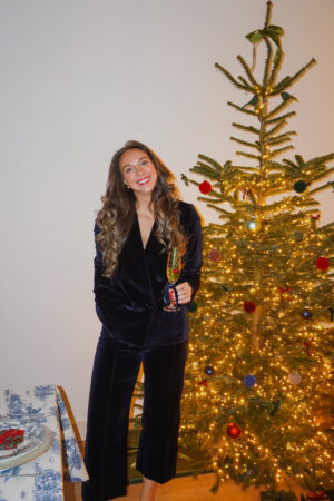 I wore this gorgeous navy blue velvet set from Sézane, which was a perfect match for my color scheme. It photographed beautifully, was dark enough to hide the inevitable spills from cooking and eating, and required zero maintenance. I didn’t have to worry once about fixing it or whether it still looked good, which is exactly what you want when you’re busy cooking and entertaining guests.
