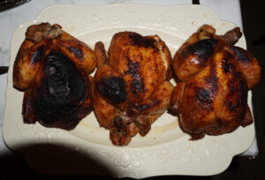 As for the roast chicken, it’s the perfect dish to serve at a dinner party. It’s easy, delicious, and requires minimal prep or attention during the event. The day before, I bought the chickens and seasoned them. On the day of, all I had to do was pop them in the oven, glazing every hour, until it was time to eat. I timed it so they were ready to be served hot from the oven alongside the risotto.